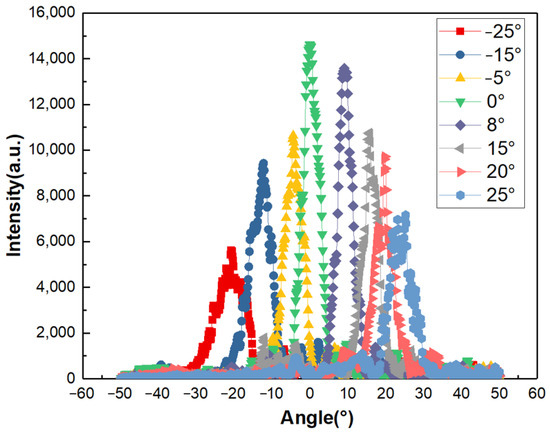 The measured beam intensities at different steering angles in the far-field are shown in Figure 9. The maximum steering angle is measured to be ±25°, which is limited to the integrated laser power and the detection limitation of the optical detection system. A more accurate control algorithm and a higher precision in the voltage should be used to steer the beam towards large angles with lower side-lobe noise in the future.