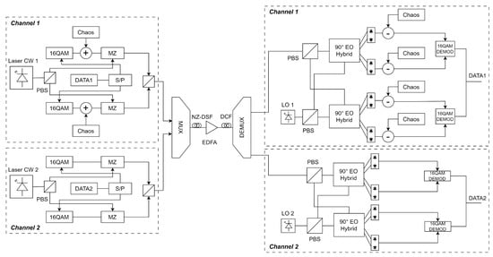 - Anh, D.V.; Tran Thi Thanh, T.; Huu, L.N.; Dung Truong, C.; Xuan, Q.N. Performance Analysis of High-Speed Wavelength Division Multiplexing Communication between Chaotic Secure and Optical Fiber Channels Using DP-16QAM Scheme. In Proceedings of the 2020 IEEE Eighth International Conference on Communications and Electronics (ICCE), Phu Quoc, Vietnam, 13–15 January 2021; pp. 33–38. [Google Scholar] [CrossRef]