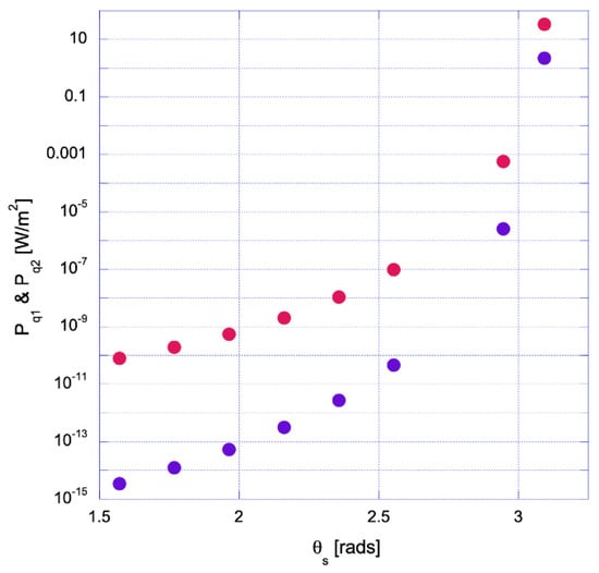 The power flux integrated in frequency is also strongly dependent on the direction of radiation, as shown in Figure 4. The X-polarization integrated spectral power is shown in red (quadrature ) and its orthogonal quadrature () in blue, averaged for an electron disk incoming at the central part of the laser pulse. The radiated power includes RR and the corresponding TS as a function of the scattering angle. Scattering is computed in the YZ plane. Notice that for a scattering angle of , the light is nearly completely polarized along the X-axis (extremely small blue dot at the bottom left of Figure 4). Notice also that the two orthogonal contributions (the two quadratures) become more balanced as the scattering angle approaches . At the same time, most of the power is emitted in the region close to .
