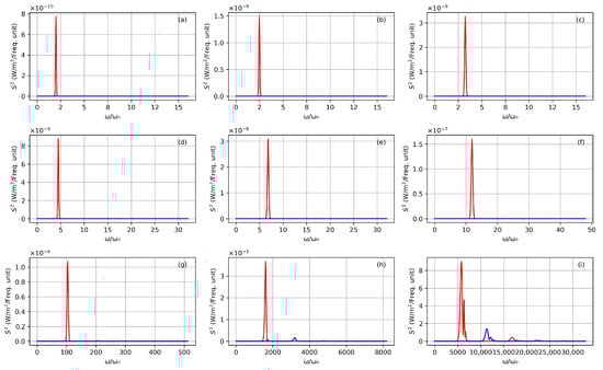 A schematic representation of the scattering geometry is shown in Figure 5 and detailed TS spectra are depicted in Figure 6. Red spectra correspond to the quadrature, i.e., to the polarization parallel to the pulse transverse electric field. It is Doppler-shifted and also shows a bit of the third harmonic (Doppler-shifted too). The blue spectra correspond to the polarization in the YZ plane (the quadrature). Because they are generated by the motion due to the laser pulse magnetic field contribution, they correspond to even harmonics (even Doppler-shifted harmonics). In this case, which we refer to as not so extreme, RR Thomson spectra still show a peaked structure. The broadening of the peaks in (i) is a Fourier effect, and the structure in each peak does not correspond to any resonances. These plots correspond to the far field. In our calculations, we have considered the radiation in the YZ plane at a distance from the beam waist. This distance is sufficient to be considered the far field. In the rest of the cases considered, the far field is calculated in the same way.