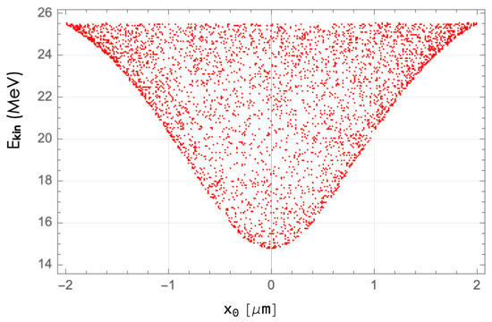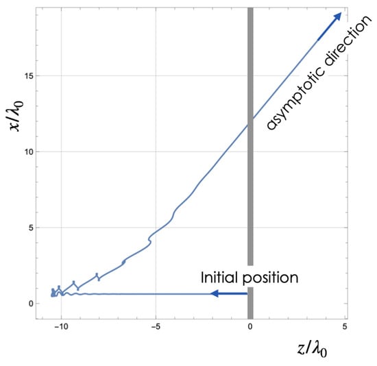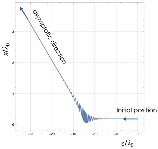 The interaction shown in Figure 7 indicates that the electron is deflected at an angle from its initial direction due to the ponderomotive force. This initial symmetry is disrupted by the laser pulse’s phase, and different carrier–envelope phases (CEPs) of the pulse will result in varying deflection directions. This figure validates that the interaction between the laser pulse and electrons is weak at the initial distance; thus, there is no need to consider initial positions further away.