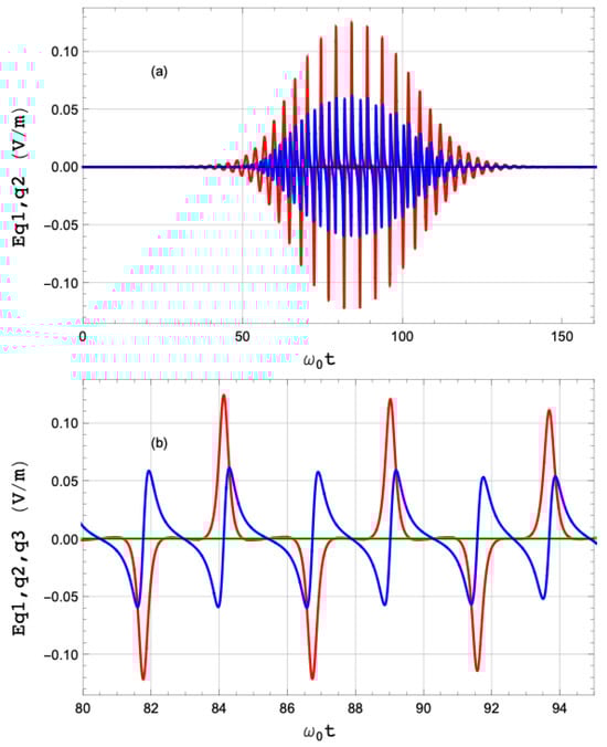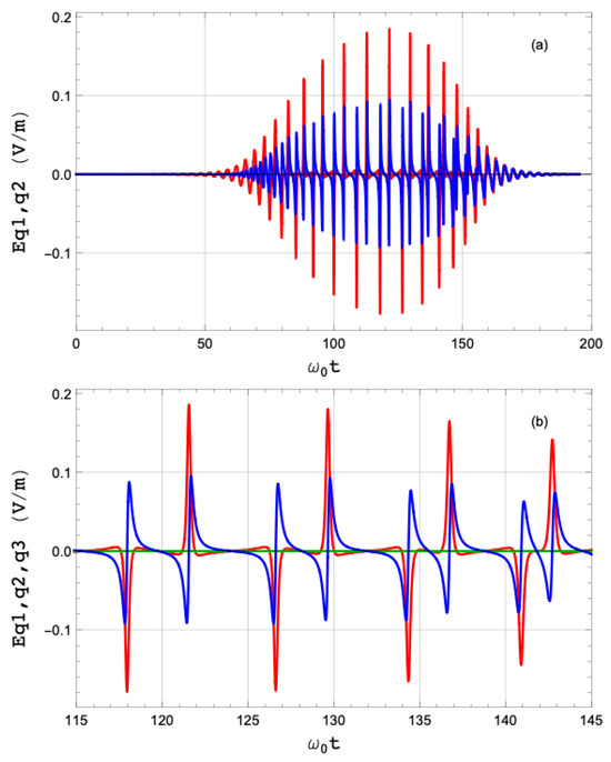 It has been demonstrated that under various circumstances, driven electron dynamics can generate trains of attosecond pulses [33,34,35]. Figure 9 shows the radiated electric field; (a) provides an overview of the driving period, and (b) zooms into the region with the most intense driving. The radiated electric field components along the X-axis (red) and the YZ plane (blue) are displayed. The component along the scattering vector (green) is negligible.