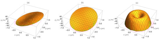 Three-dimensional asymptotic distributions of (a), (b), and (c) as functions of the initial transverse position of the electrons. The panels show 4096 sample electrons, uniformly and randomly distributed up to .
