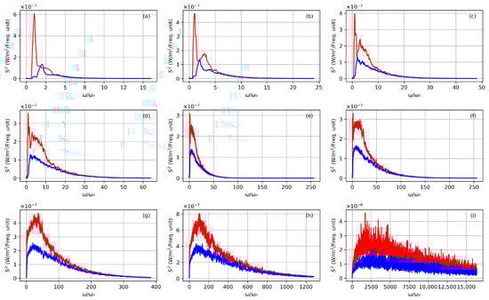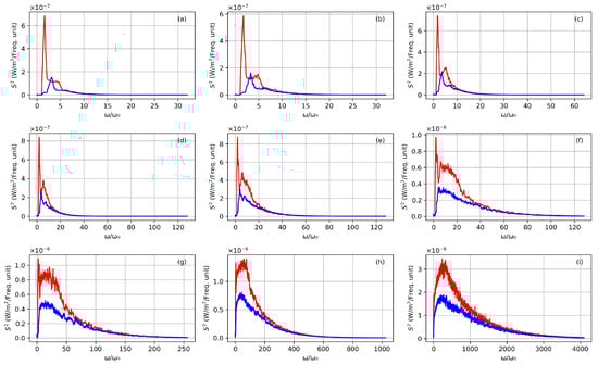 Averaged TS spectra including RR for several scattering angles in the YZ plane; see main text for details. (a–i) Scattering angles are, respectively, , , , , , , , , and . Observe that the last one, (i), corresponds to scattering almost perfectly counter-propagating to the laser pulse. The colors red and blue are the same as in the previous figure, with quadrature in red (polarization along the electric field) and quadrature in blue.