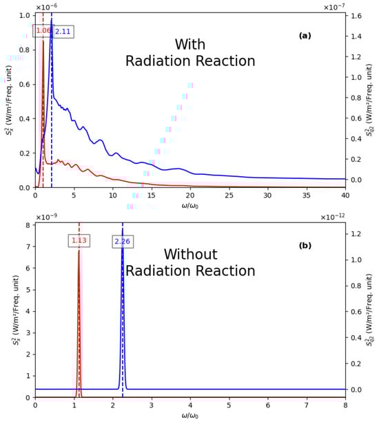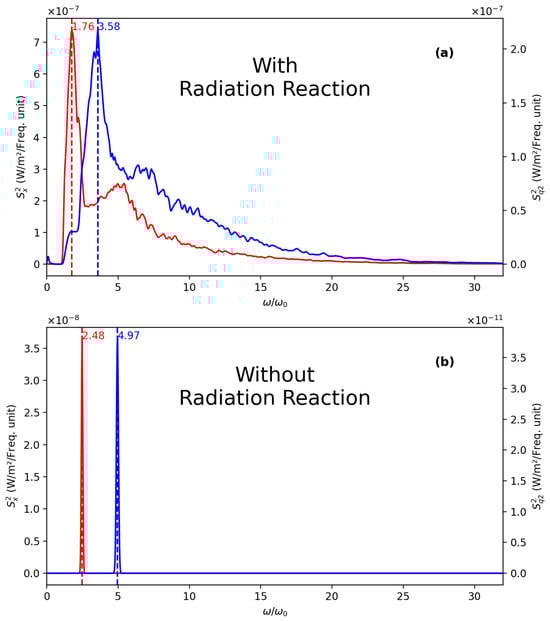 RR affects the TS spectra not only by altering the profiles of both quadratures but also by shifting the peak positions. This shift results from the reduced electron speed and thus a reduced Doppler shift of the TS radiation. The frequency positions of these peaks are indicated in Figure 14 relative to . Notably, the blue peak remains at twice the frequency of the red one due to the interaction with the laser magnetic field.