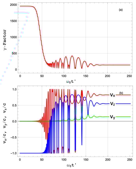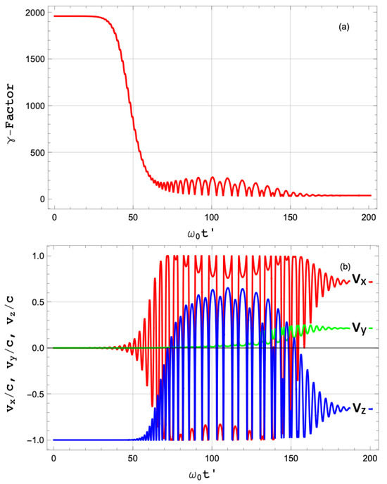 Figure 8 shows the time evolution of the factor and different velocity components for the parameters in this section. The plot reveals the asymptotic value of the velocity once the interaction with the laser pulse ends and a sudden reduction in kinetic energy due to RR.