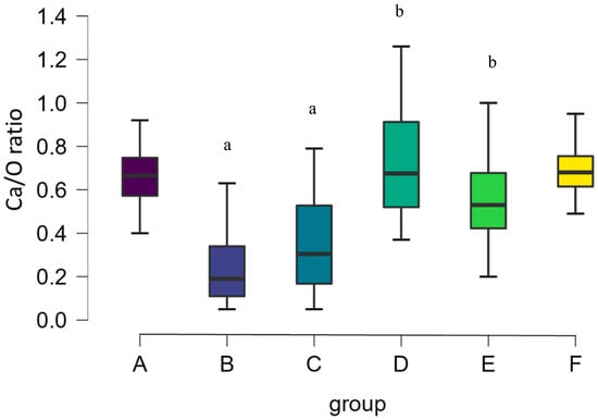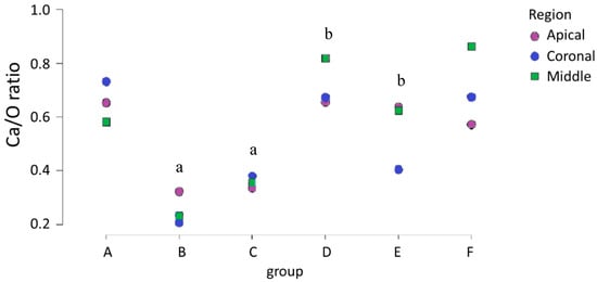 Changes in Ca/O in the root canal surface according to coronal, middle, and apical regions following Er:Yag laser activation with the irrigation methods: (A) Control; (B) Er:YAG laser with 17% EDTA continuous irrigation for 60 s; (C) Er:YAG laser with 15 s 4 intermittent 17% EDTA irrigation; (D) Er:YAG laser with 17% EDTA continuous irrigation for 60 s followed by 2.5% NaOCl; (E) Er:YAG laser with 15 4 intermittent 17% EDTA irrigation followed by 2.5% NaOCl; and (F) Er:YAG laser with 60 s continuous 2.5% NaOCl irrigation. Data are average of 10 teeth in each treatment group. Ca = Calcium, O = Oxygen. a: p < 0.001 in comparison to control (group A). b: p < 0.001 in comparison to EDTA without NaOCl. Statistical significance is presented in Table 3.