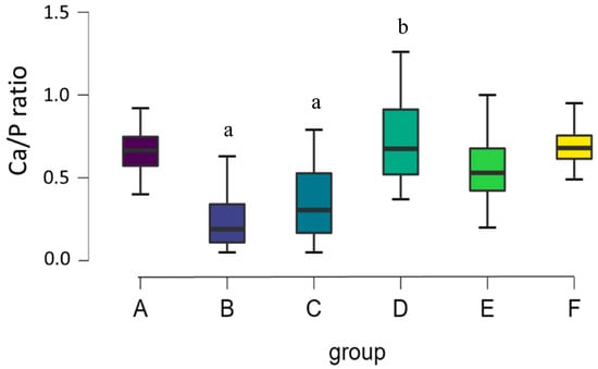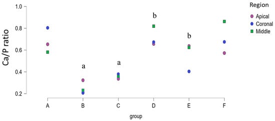 Changes in Ca/P in the root canal surface according to coronal, middle, and apical regions following Er:YAG laser activation with the irrigation methods: (A) Control; (B) Er:YAG laser with 17% EDTA continuous irrigation for 60 s; (C) Er:YAG laser with 15 s 4 intermittent 17% EDTA irrigation; (D) Er:YAG laser with 17% EDTA continuous irrigation for 60 s followed by 2.5% NaOCl; (E) Er:YAG laser with 15 4 intermittent 17% EDTA irrigation followed by 2.5% NaOCl; and (F) Er:YAG laser with 60 s continuous 2.5% NaOCl irrigation. Ca = Calcium, P = Phosphate. a: p < 0.001 in comparison to control (group A). b: p < 0.001 in comparison to EDTA without NaOCl.