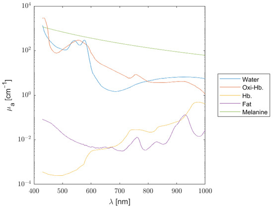 where B is the average blood volume fraction, S is the oxygen saturation, W is the fractional water content, F is the fat content, and finally, M is the melanosome volume fraction. Each absorbing chromophore has its own spectral signature, as illustrated in Figure 1, from which the total absorption for each layer can be estimated (Figure 2).