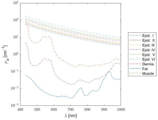 with the wavelength in nm. This equation was parameterized by the scaling factor , in units of , and the dimensionless scattering power b. The parameters specifying in each tissue layer are given in Table 2. For the epidermis and dermis, a and b were fitted to the data found in [22]. Fat parameters were based on average values compiled by several authors of [18]. Muscle parameters a and b were fitted to ex vivo data from [23] for a spectral range of 620–1000 nm. The anisotropy coefficient g for epidermis and dermis for wavelengths in the range nm was found in the comprehensive review of [24]:
