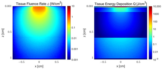 Monte Carlo simulation results of fluence rate () and absorbed energy () density distribution of wavelength 808 nm in a cheek tissue section with the following model parameters: , cm, and cm.