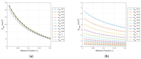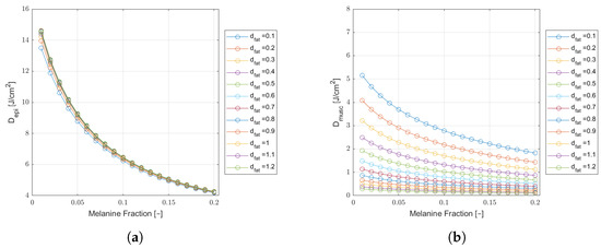 Monte Carlo simulation results of epidermal (a) and muscle (b) fluence () as a function of melanin fraction, for a wavelength of 660 nm, in a cheek tissue with cm and varying fat thicknesses. Results for a safe incident laser power of and an extraoral delivered dose of J.