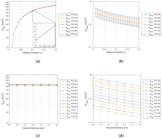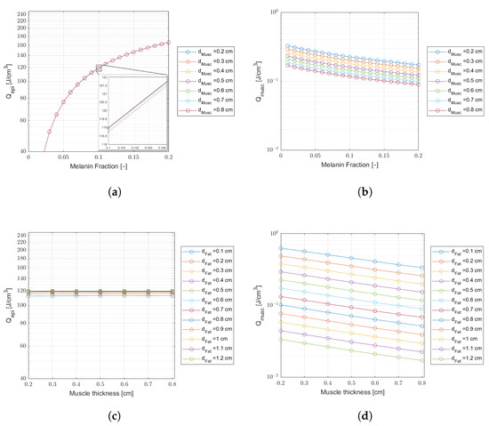 Comparing laser energy density deposition at the epidermis and muscle for a wavelength of 808 nm, an incident laser power of 30 mW, and a treatment time of min ( J delivered dose). Plots (a,b)—Curves of variable melanin fractions for different muscle thicknesses, and a fat thickness cm. The inset on (a) shows tiny differences in energy density. Plots (c,d)—Curves of variable muscle thicknesses for different fat thicknesses, and a melanin fraction .