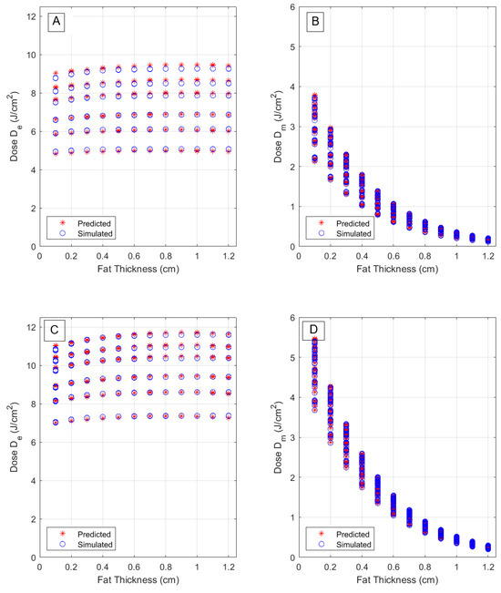 Predicted versus the actual simulated fluences, as functions of fat layer thickness, at the epidermis and muscle layers (A,B) for a wavelength of 660 nm and (C,D) a wavelength of 808 nm. A J delivered total dose is assumed.
