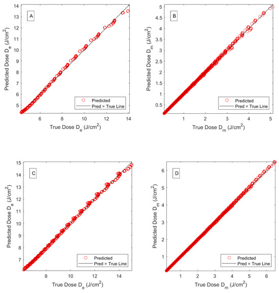 The performance results of regression MLPM, described before, are summarized in Table 4. As mentioned before, linear regression was applied to the logarithm of epidermal and muscle fluence rates. The best performing linear regression (LR) models allowed for linear interactions with quadratic terms. Feature importance algorithms revealed that the melanin fraction was most important among the three features included (muscle and fat thickness, and melanin fraction) for predicting epidermal doses, while, as expected, fat thickness was most important when predicting muscle doses. However, removing one of the other two features did not yield consistent and performing models that would perform similarly for both response variables and laser wavelengths. Both training and test RMSEs, as well as the MAE, are low, indicating that overfitting is unlikely to occur. Mean Bias Error was computed from the residuals of the training and test sets to assess bias, yielding very small values of the order of in both cases. Response plots for a subset of the training set (corresponding to melanin fractions given in Table 3) are presented in Figure 9 for wavelengths of 660 and 808 nm. Figure 10A,B present the LR predicted versus the true (MC simulated) fluences, at epidermis and muscle layers, for each wavelength. The muscle dose plots reveal a more consistent structure with the linear model even though the values are practically 1 in both cases.