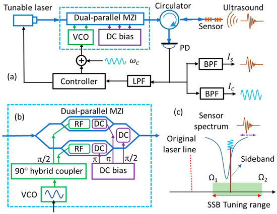 Figure 1 shows a schematic of the fiber-optic ultrasonic sensor system. As an example, and to be consistent with the laser used in the experiment, we assume that the sensor is a high-finesse FP formed by two FBGs, and one of its narrow reflection notches (see the inset of Figure 1) is used for ultrasonic detection. The light source is a low-noise, tunable laser with a relatively slow tuning speed. The laser from the light source is injected into a single-sideband generation module consisting of a DP-MZI, a VCO, and a DC bias unit. A more detailed diagram of the single-sideband generation unit is shown in Figure 1b. The output from the DP-MZI is a laser line whose frequency is shifted from the original laser line by the RF signal from the VCO, as shown in Figure 1c. Adjusting the voltage of the VCO will tune the laser frequency in the range corresponding to the frequency range of the VCO. The quasi-DC component of the output of the photodetector, which detects the light reflected from the sensor, contains the information of the operating point, which is filtered out and used to lock the sideband to the slope of the sensor reflection spectrum. Combining the inherent wavelength tuning mechanism of the laser in the agile tuning from the DP-MZI will provide the ability to precisely lock the laser line to the desired position of the narrow spectral notches of the sensor over a large spectral range.