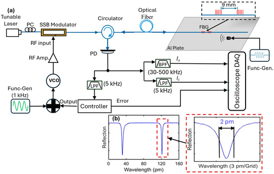 To demonstrate the locking and calibration of fiber-optic ultrasonic sensors using single-sideband-modulated laser schemes, the experimental setup was constructed as illustrated in Figure 2. The sensor employed in this experiment was a high-finesse inline FP interferometer formed by two FBGs separated by a span of 8 mm long fiber. The two FBGs were identical, each having a length of 4 mm and a reflectivity of ~95%. The reflection spectrum of the sensor features a few notches within the reflection bandwidth of the FBG with a spectral separation of ~80 pm between neighboring notches. The one closest to the FBG peaks shows the narrowest spectrum and was selected for locking the laser for ultrasound detection. Figure 2b shows the spectrum of the notch measured using a wavelength-scanning laser and a photodetector, exhibiting a 3 dB spectral width of approximately 2 pm. The sensor was positioned on the surface of an aluminum plate, and an ultrasonic couplant gel was applied to ensure efficient coupling of ultrasonic waves between the plate and the sensor. A piezoelectric transducer was used to generate the ultrasonic signal, which was driven by a function generator set to produce a 120 kHz, 15 V peak-to-peak sinusoidal waveform with 5-cycle bursts. The signal had a repetition rate of 0.025 ms (equivalent to 40 Hz), ensuring consistent and repeatable ultrasonic pulses for testing the performance of the sensor system.