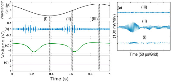 We evaluated the robustness of the real-time wavelength tuning and the locking method against signal variations caused by operating-point changes. The operating point was changed by scanning the laser wavelengths using a 1 Hz sinusoidal wave, which resulted in a sinusoidal modulation of the laser wavelength with peak-to-peak wavelength shift of 12 pm, as shown in Figure 3a. This wavelength shift range is six times the spectral width (2 pm) of the spectral notch. Figure 3d shows the output from the PID controller under the locked condition when the feedback control loop was closed. This signal was amplified and injected into the single-sideband generation module to tune the laser sideband for locking. The controller output signal was opposite to the modulation signal for the laser wavelength, which is expected as the controller output tuned the laser sideband to maintain it at the same location on the spectral slope of the sensor. The error signal, shown in Figure 3c, is close to 0, which verifies that the system was in locked condition. Figure 3b shows the ultrasonic pulses that were measured by the sensor system as the wavelength was scanned. The recorded pulses exhibited consistent amplitudes during the whole range of the laser wavelength scanning. The measured pulses when the laser wavelength was at three different locations are shown in more detail in Figure 3e, demonstrating the robustness of the real-time wavelength tuning and locking method in compensating for signal variations caused by operating-point changes.