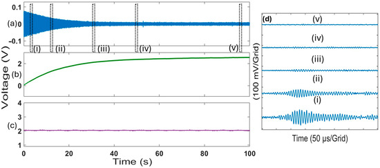 The results are presented in Figure 5a–d, which shows the various signals under the applied thermal variation. As shown in Figure 5a, the ultrasound signal remained stable with constant amplitudes throughout the temperature change, demonstrating that our system effectively maintained performance despite the induced wavelength shifts. Figure 5d provides a detailed view of the stabilized ultrasound signals at five different temperature points, highlighted in Figure 5a. The minimal variation in signal amplitude across these points underscores the efficacy of our method in maintaining signal integrity under thermal stress. This stability confirms the method’s ability to compensate for temperature-induced variations, ensuring consistent sensor operation without significant fluctuations in the amplitude of the ultrasound signals.