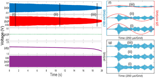 We evaluated the effectiveness of the proposed real-time in situ calibration method against optical power fluctuations. The optical power changes were introduced by manually adjusting the variable optical attenuator (VOA) that reduced the optical power transmitted into the sensor. A data acquisition (DAQ) system with a sampling rate of 2 MS/s was utilized to continuously record both the ultrasound-induced signals () and the calibration signals (). The resulting data are illustrated in Figure 7. The ultrasound-induced signals () and the calibration signals () are directly proportional to the optical power. Figure 7a,b demonstrate that the variations in optical power, as indicated by the envelopes of the ultrasound signal (), are consistent with those of the calibration signal (). As part of our results, Figure 7c–e illustrate key signals within the system. Figure 7c shows the error signal. It remained at zero throughout the experiment, indicating that the sensor system was in the locked state during the process. Figure 7f provides a detailed view of the ultrasound signals () and calibration signal () obtained at the three operating points highlighted in Figure 7a,b, which shows large variations in their amplitudes. The amplitude of the calibration signal, which is the system’s response to a known laser wavelength variation, contains information on the system’s sensitivity. The calibration is carried out by simply dividing the detected ultrasonic signal by the amplitude of the calibration signal. Figure 7g shows the recorded ultrasonic signals after calibration, which exhibit approximately equal amplitude, indicating the effectiveness of the real-time in situ calibration method against optical power variations.