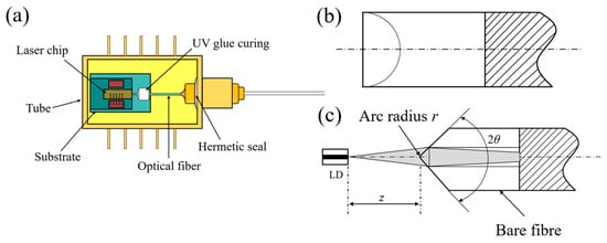 As shown in Figure 1, the optical module part of the device mainly includes the tube shell, the substrate, a thermoelectric cooler (TEC), a laser chip, a wedge-shaped lens fiber, UV glue, an airtight sealing device, and other parts. The wedge-shaped lens fiber mainly has two parameter controls, namely the wedge angle 2θ and the top arc radius r. The center wavelength λc of the wedge-shaped lens fiber is 974.5 nm, the peak reflectivity at the center wavelength is 3%, the full width at half maximum is 0.25 nm, the sidelobe suppression ratio (SLSR) is 10 dB, and the length of the rear grating fiber is 70 ± 8 mm. There is a grating region at the tail of the optical fiber to stabilize the laser spectrum. Detuning with the optimal wavelength affects the coupling efficiency of the lens fiber by changing the spot radius and the curvature radius of the beam. The reflectivity of the semiconductor laser output mirror is 6%. The wedge-shaped lens fiber produced by YOFC company was used in the experiment.