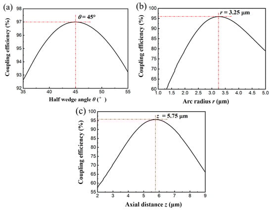 Simulation results of the relationship between half wedge angle (a), arc radius (b), axial distance (c), and coupling efficiency.