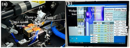 The semiconductor laser used in our experiment was a 980 nm ridge waveguide semiconductor laser. Its special ridge structure can suppress high-order modes of the optical field and achieve reliable transmission of the fundamental mode. The LD output laser has a slope efficiency of about 85%, a fast axis divergence angle of 37°, a slow axis divergence angle of 12°, and a chip ridge width of 4 μm. Figure 3 is a schematic diagram of the variation in LD output optical power with current. During the experiment, the optical fiber was fixed using two sets of fixtures. The rear fixture mainly fixed the metallized part of the optical fiber, while the front fixture mainly clamped the bare core part of the optical fiber to keep it horizontal. Two sets of fixtures can adjust the position of the fiber from eight directions—up, down, left, right, front, back, clockwise rotation, and counterclockwise rotation—maintaining the horizontal relationship between the fiber wedge surface and the workbench. The fiber optic end is connected to the power meter, and by adjusting the relative position of the lens fiber and LD, the power meter can display the current coupling power in real time. As shown in Figure 4, Figure 4a is a schematic diagram of fixing optical fibers with two sets of fixtures at the front and rear, and Figure 4b shows results derived from testing the laser power after coupling. The ratio of this power to the output power of the laser chip is the coupling efficiency of the coupling system. The key components of the experimental plan include the optical module, clamp 1, clamp 2, the wedge-shaped lens fiber, the LD laser chip, and UV glue curing, which have been labeled in Figure 4. Figure 5a,b show the laser far-field profile distributions of the slow and fast axes at 80 mA, respectively. Figure 5c,d show the laser far-field profile distributions of the slow and fast axes at 780 mA, respectively. As the current increases, the far-field divergence angles of both the fast and slow axes increase.