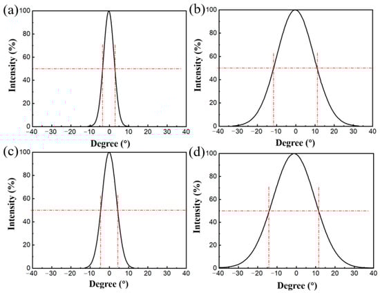 (a,b) show the laser far-field profile distributions of the slow and fast axes at 80 mA; (c,d) show the laser far-field profile distributions of the slow and fast axes at 780 mA.