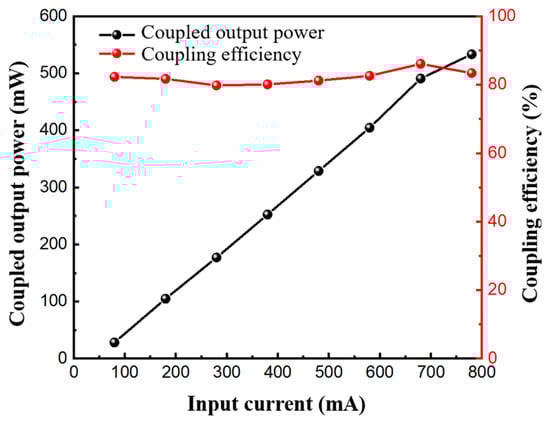Our experiment of coupling semiconductor lasers with optical fibers tested the output laser power values of LD chips at different input currents; subsequently, we recorded the output power of the laser when passing through the lens fiber at different input currents. Figure 6 is a schematic diagram of the relative position between the lens fiber and the ridge semiconductor laser. From the figure, it can be seen that the distance between the lens fiber and the semiconductor laser-emitting surface is about 3.5 μm, which is approximately equal to the radius of the circular arc at the front end of the lens fiber. As shown in Figure 7, the power output of the laser through the lens fiber was measured at currents of 80 mA, 180 mA, 280 mA, 380 mA, 480 mA, 580 mA, 680 mA, and 780 mA. From the graph, it can be seen that the maximum coupling efficiency of the coupled system can reach 87.1%, and the average coupling efficiency can also reach 84%. However, after UV glue fixation and tail pipe soldering, the coupling efficiency is reduced, which is caused by the thermal stress generated by the UV glue curing and tail pipe soldering processes exerting an effect on the optical fiber. The welded optical module needed to undergo temperature cycling experiments to verify the stability of the coupling system. In the heating stage, the temperature was increased from room temperature to 85 °C at a rate of 5 °C/min; during the high-temperature maintenance phase, the temperature was maintained at 85 °C for 2 h; during the cooling phase, cooling down to −40 °C took place at a rate of 3 °C/min; and during the low-temperature holding phase, the temperature was maintained at −40 °C for 2 h. We repeated these steps 10 times. From Figure 8, it can be seen that the coupling efficiency changed before and after the temperature cycling experiment. The average coupling efficiency of the first seven groups of devices in the temperature cycling experiment was 83.4%, and the average coupling efficiency of the devices after the temperature cycling experiment was 81.7%, with a decrease in coupling efficiency of 1.66%.