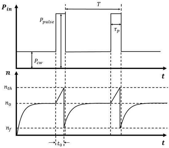 Where is the power of the continued pump,, is the power of the pulse pump, is the duration time of the pulse pump, is the delay time of reaching the laser threshold relative to the leading front of the high-power pumping pulse, , is the repetition period of the composite pump, is the density of the initial inverse population generated from the continuous low-power pump, is the density of the threshold inverse population and is the density of the release inverse population.