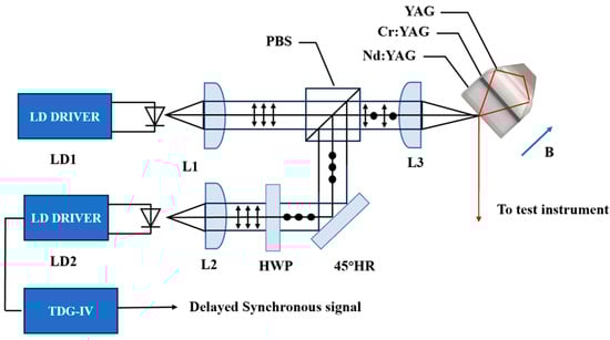 4+: YAG with a thickness of 1 mm and an initial transmission of 73% was used as a passive saturable absorber and was bonded to the Nd: YAG NPRO by thermal diffusion. The input surface, which also serves as the output coupler, was multi-dielectric-coated for high transmission at 808 nm and for 10% output coupling of the S-polarized beam at 1064 nm. To achieve unidirectional oscillation, a magnetic field of 0.3 T was applied along the NPRO. Two laser diodes (Skyera, FM808W01, Zhenjiang, China), emitting at 808 nm and combined by a polarizing beam splitter (PBS), were driven by two independent currency modules to generate a continuous pump and short-pulse pump. A digital delay generator (Fastlaser, TDG-IV, Beijing, China) with four channels was used to trigger the driver of the pulse pump and control the pulse duration. To achieve optimal mode matching between the pump light and the oscillation laser mode, the pump beam was focused into the passively Q-switched NPRO using 2:3 coupling optics. The temperature of the NPRO was controlled at 25 °C by using a thermal electric cooler.