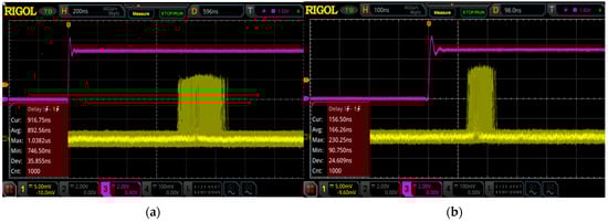 It can be seen from Figure 5 that, compared to single-pulse pumping, the composite pumping method can effectively reduce the output-pulse timing jitter, which is in accordance with our theoretical analysis. As the pulse pump power increases, the impact of the value of the continuous pump power (i.e., the value of ) on the reduction ratio of the pulse timing jitter becomes smaller. It was also found in the experiment that, when the ratio of continuous pump power to threshold pump power exceeds 90%, it easily leads to false triggering of the pulses. Finally, with the continuous pump power fixed at 90% of the threshold pump power (~3.25 W), and under the condition of a pulse pump power of 40 W with a pump duration time of 7 µs, a remarkably low timing jitter of 14.568 ns was obtained, corresponding to an average pulse width of 5.99 ns.