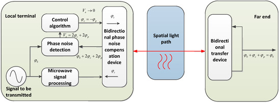 The phase noise represents the optical path changes in the spatial optical path. We can achieve fine measurements of spatial distance by measuring phase noise. The system of the frequency transfer is shown in Figure 3.
