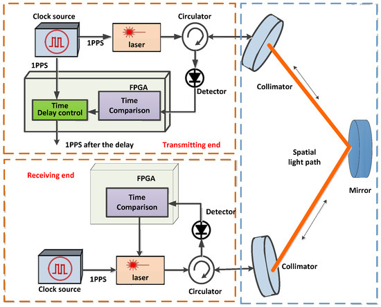 The time transfer system adopts a bidirectional comparison scheme, as shown in Figure 2. The bidirectional comparison time synchronization system for the transmitter comprises a clock source, a modulation module, a demodulation module, and a time-interval measurement module. The receiver includes a demodulation module, a time-interval measurement module, an operational control module, a modulation module, and a delay control module. Time transfer based on bidirectional comparison is achieved by transmitting 1PPS (one pulse per second) signals from the transmitter and the receiving end. By comparing these times, the clock difference can be calculated and used to compensate for the clock of the transmitter to synchronize the two clocks [19].