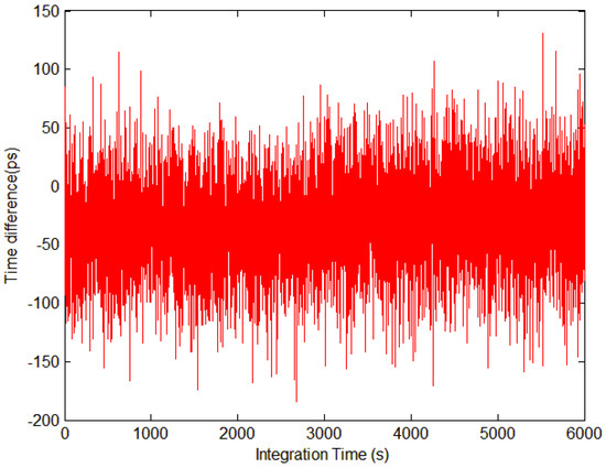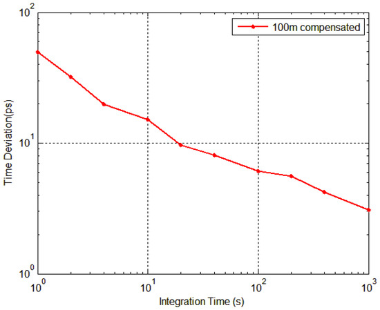 The experiment tested the time difference between the transmitter and the receiver of the 100 m time synchronization system after compensation. As illustrated in Figure 6, the time difference is within 150 ps. According to (11), the TDEV result is shown in Figure 7, achieving a time synchronization stability of 41.8 ps@1 s and 3.2 ps@1000 s.