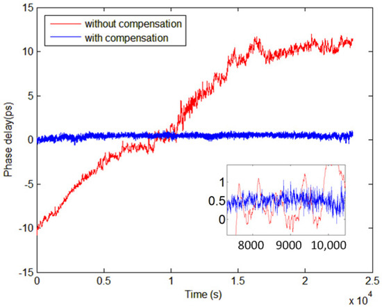 We developed a 100 MHz frequency transfer system using a 100 m space optical path. To evaluate the system, we compared the link delay jitter with and without compensation. As shown in Figure 8, the jitter is significant without compensation, showing a noticeable drift in one direction. The delay drift reaches ±25 ps within a 25,000-s period. This instability is caused by external factors like temperature and atmospheric conditions which affect laser transfer in space. The one-directional drift is attributed to device noise caused by temperature changes. Without compensation, the frequency transfer remains unstable. After compensation, the jitter of the link delay is significantly reduced, and the delay drift is effectively controlled. It can be seen that the peak-to-peak value of the delay jitter within 25,000 s is less than 1 ps, and the corresponding distance measurement accuracy is controlled within 3 × 10−4 m. This improvement results from the use of optical fiber delay lines controlled by the PID algorithm for link delay compensation, offsetting the delay jitter. This method ensures the accuracy of the frequency signal transfer, thereby acquiring precise delay and distance information. Improved delay stability also means an improvement in the stability of the laser ranging.