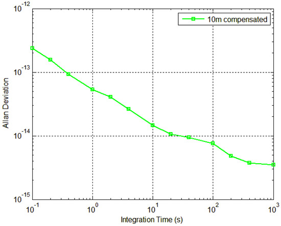 We use the phase noise analyzer 5125 A to measure the frequency stability of the 100 MHz signal in the frequency transfer system based on the optical fiber delay line. The experimental results are shown in Figure 9. The system successfully compensates for the frequency signal jitter, achieving a stability of 4.17 × 10−14@1 s and 2.51 × 10−15@1000 s for the 100 MHz signal.