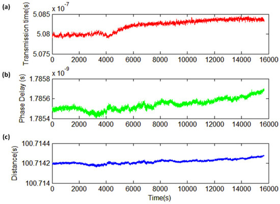 When the space path distance is 100 m, the experimental results of ranging are shown in Figure 10. Figure 10a presents the rough ranging result based on the time comparison. As shown, the ranging result fluctuates up to a value of 0.04 m. When the signal frequency in the frequency transfer system is 100 MHz, the phase measurement range c/4 f is 0.75 m, which is much smaller than the precision of the rough ranging. Thus, a combination of rough and fine ranging can be achieved. The ranging speed is influenced by the frequency of the phase detection and the processing speed of the algorithm, achieving 20 measurements per second. Therefore, using the system proposed in this paper for laser ranging can obtain accurate ranging results in a short time. Figure 10b shows the fine ranging results obtained by the frequency transfer system. After compensation, the jitter in the fine measurement distance is 0.0002 m, which is much higher than the precision of the rough ranging. Combining these two sets of data, we can get the final ranging results in Figure 10c. We can conclude that within 16,000 s, the jitter in the ranging results is 0.0002 m, which is consistent with our theoretical expectations.