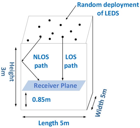 As shown in Figure 1 is a traditional indoor visible light communication system model [14]. With a room size of 5 m × 5 m × 3 m, the following coordinate system was established: the center of the floor as the origin of the coordinate system O, respectively, connecting the origin with the midpoint of the width and length of the room, and its connecting line as the x-axis and y-axis, and the xoy plane is coincident with the ground. The light source LEDs are distributed on the ceiling, and the receiver is located on the receiving plane at a height of 0.85 m.