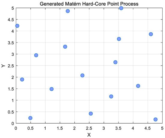 First, a chi-square Poisson point process with intensity is generated as the parent point process, and an independent random variable m(x), called the marked value, is added to each point x. The marked values are uniformly distributed in the interval [0, 1]. The tagged values of all the points are checked, and a point is retained only if it satisfies the requirement that its tagged value is less than the tagged values of all the points within a circle of radius r centered on it; otherwise, the point is deleted. The point process, which consists of the remaining points after such deletion is called the Matern hardcore point process. It is expressed in mathematical notation as