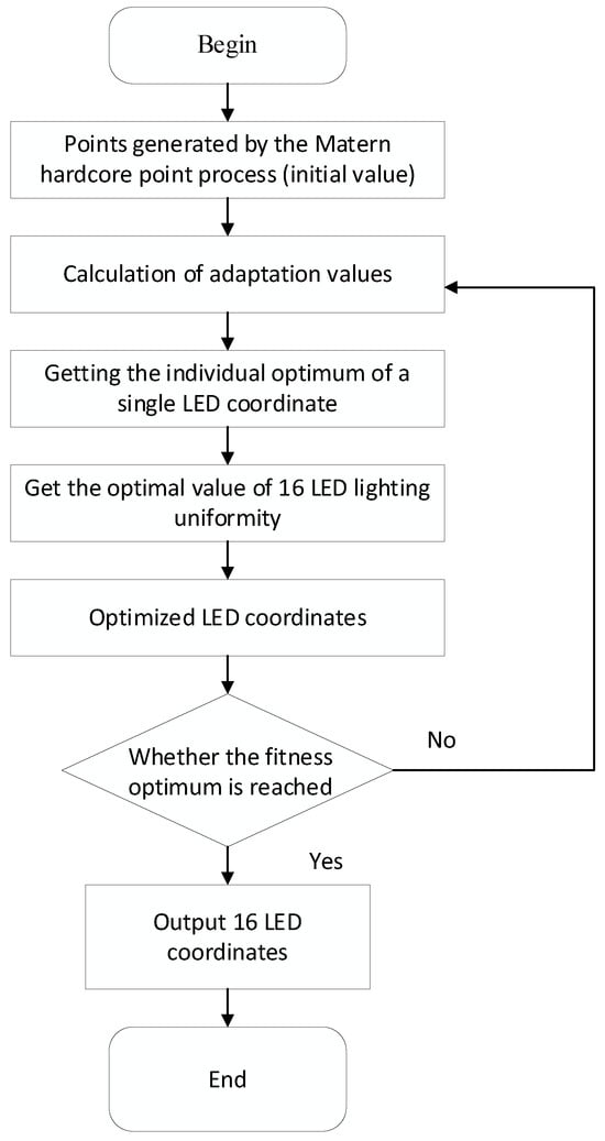 In this paper, the particle swarm optimization algorithm is improved. Considering the combination of the Matern hardcore point process with the particle swarm algorithm, the points generated by the Matern hardcore point process can be directly used as the initial particle positions of the particle swarm optimization algorithm, which generates an initial layout, so that the algorithm starts with a reasonably distributed layout of the light sources, which helps to accelerate the optimization process and may increase the chances of finding a more optimal solution. In the particle swarm algorithm, the coordinates of these points will be considered as the initial positions of the particles and further adjusted according to the optimization objective to find the best layout. A block diagram of the flow of this algorithm is shown in Figure 3 [23].