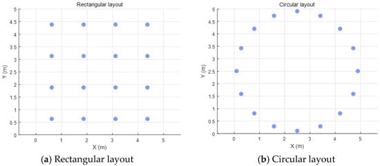 This section simulates and analyzes the performance of the indoor visible light communication system under rectangular and circular layouts; the detailed parameters are shown in Table 1. As shown in Figure 4a,b, the light source distribution diagram under the rectangular layout and the circular layout are respectively, which consists of 16 lamps.