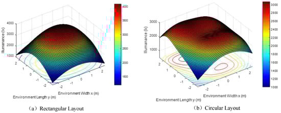 According to the above parameter conditions, the simulation analysis is carried out under the condition of using 16 LEDs for a flat room of 5 m × 5 m × 3 m. As shown in Figure 5a,b are the simulation results of the light intensity under the rectangular and circular layout, respectively, the rectangular layout of the center of the region with the highest light intensity of 4079.02 lx, gradually decreasing to the surrounding area, and the edge of the region with the lowest light intensity of 1206.38 lx; the average value is 2836.37 lx, far more than the lighting standards, which may be harmful to the human eye. The uniform illuminance ratio is 0.42. The light intensity of the circular layout ranges from 3062.36 to 998.64 lx, with an average value of 2486.64 lx.