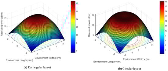As shown in Figure 6a,b are the simulation result graphs of received power under rectangular and circular layouts, respectively. The maximum value of received power in the rectangular layout is 18.52 dBm, and there is a minimum value at the corner of the 5.47 dBm, the average value is 12.88 dBm, the peak power deviation is 0.71, the received power fluctuates greatly, and the communication is not stable. The power in the central region of the circular layout is higher at 16.02 dBm and gradually decreases in all directions and gradually decreases to 5.20 dBm at the edges, with an average received power of 12.79 dBm and a PPD of 0.67. The value of PPD is lower than that under the rectangular layout, which indicates a more stable communication performance than that of the rectangular layout.