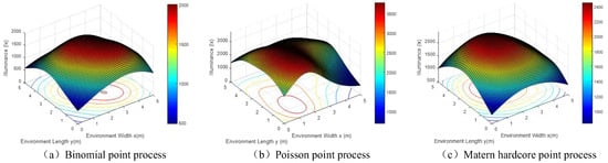 As shown in Figure 8a–c, the simulation results of light intensity under the layout of the binomial point process, Poisson point process, and Matern hardcore point process are presented. It can be seen from the figures that the binomial point process layout achieves the highest light intensity in the central area, reaching 2002 lx. As it spreads outwards, the light intensity gradually decreases, and when it reaches the edge area, the light intensity drops to a minimum of 490 lx, with an average illuminance of 1390 lx, which meets the indoor international lighting standard illuminance. The maximum illumination intensity area of the Poisson point process layout appears near the center to the left, reaching 3700 lx. The illumination intensity of other areas varies greatly, and some areas have significantly lower illumination intensity than the central area. The UIR is 0.27, and the indoor lighting fluctuates greatly. The center of the room is too bright, and prolonged lighting can cause harm to the human eye. For the hardcore point process layout of material, introducing the minimum distance constraint ensures that the light sources are not too close to each other, avoiding the local high-intensity areas caused by excessive concentration of light sources. The light intensity shows a smooth downward trend from the center to the surrounding areas, indicating that the distance between light sources is reasonably controlled and the distribution of light sources is relatively uniform. The UIR is 0.47, indicating an improvement in lighting uniformity compared to the layouts in the other two processes.