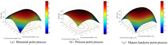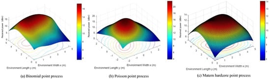 As shown in Figure 9a–c are the simulation results of received power under the binomial point process, Poisson point process, and Matern hardcore point process layout, respectively. Matern hardcore point process layout: compared with the other two layout methods, the received power is more uniformly distributed, the power transitions are smooth, and there are no obvious high and low ups and downs. The peak power deviation is 0.59, which is a small value, proving that the fluctuation is not drastic and the communication quality is better. In contrast, in the binomial point process layout and the Poisson point process layout, the values of the received power range from 3 dBm to 20 dBm, and the peak power deviations are 0.79 and 0.82, respectively, indicating that the received power fluctuations are more pronounced in these two stochastic processes, which can lead to an uneven distribution of the received power, which is significantly higher in the center region than in other regions.