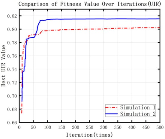 The number of iterations refers to the number of cycles executed by the optimization algorithm, and the fitness value reflects how close a solution is to the objective solution. As shown in Figure 11, the red curve represents the relationship between the number of iterations and the fitness value under the traditional particle swarm optimization algorithm. It shows that at the 300th iteration, the fitness function value UIR reaches 0.8. The blue curve represents the relationship between the number of iterations and the fitness under the combination of the Matern hardcore point process and the particle swarm algorithm. This curve shows that the number of iterations levels off around the 150th time and the fitness function UIR reaches 0.82, which is the optimal solution. This indicates that the traditional particle swarm optimization algorithm starts from a completely random initial layout, which cannot control the uniformity of light source distribution, while the particle swarm optimization algorithm based on the Matern hardcore point process mentioned in this paper takes the layout of the Matern hardcore point process that satisfies the minimum distance constraints as the initial position, which reduces the phenomenon of aggregation or dispersion of the light sources and can converge to the layout that meets the requirement of uniformity more quickly. This avoids the time waste caused by the random search in the initial stage of the traditional particle swarm algorithm. This provides a better initial distribution for subsequent optimization. The simulation results of light intensity, received power, and signal-to-noise ratio in optimized coordinates are plotted in Figure 12.