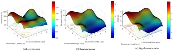 As shown in Figure 12, the light intensity is 1196.89~698.04 lx, the average value is 849.39 lx, which meets the international lighting standard, and the illumination uniformity UIR is 0.83, which indicates that the illumination uniformity in the room is at a high level, the received power is 12.48~6.36 dBm, the average received power is 9.25 dBm, and the peak power deviation is 0.47, which is 20.3% lower than that before optimization, indicating a reduced level of fluctuation and better communication. The SNR is 38.96~44.80 dB, the value of average SNR is 42.13 dB, and the ratio of minimum to maximum value is 0.86, which is an increase in the ratio, indicating a more uniform distribution of the SNR.