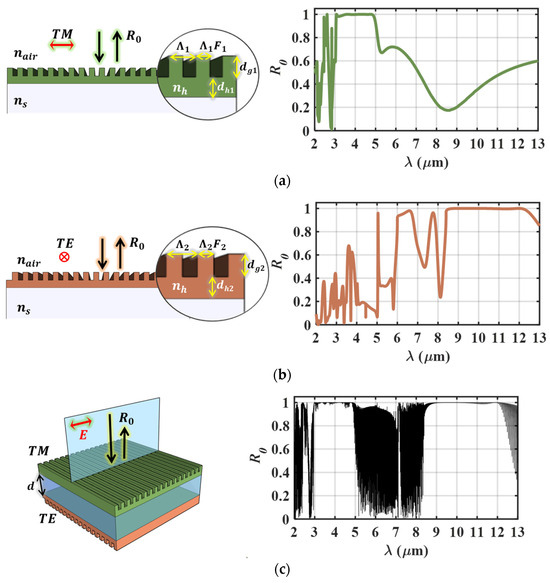 Figure 2a presents the schematic of the 1D MWIR grating reflector. In this design, we incorporate a homogeneous sublayer beneath the one-dimensional (1D) grating using the same high refractive index material. This forms a zero-contrast grating (ZCG), which facilitates superior wideband reflection to achieve [16]. The grating parameter set {} determines the geometry of the 1D ZCG, where the , , and denote a period, fill factor, grating depth, and sublayer thickness of the first part of the metasurface. By setting the refractive indices (nh = 4, ns = 1.4) and using TM polarization (i.e., electric field is perpendicular to the grooves), we determine the optimal parameter set as { = 1.73 μm, = 0.73, = 0.91 μm, = 0.5 μm} for the MWIR reflector. The simulated zeroth-order reflectance (R0) spectrum demonstrates a high reflection band spanning from 3.06 to 4.85 μm, with R0 values exceeding 0.97 remarkably achieved by the single grating layer. The wideband reflection is attributed to the merging of multiple guided-mode resonance (GMR) modes in the subwavelength regime [17]. At longer wavelengths, high reflection does not appear because GMRs are not excited.