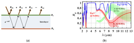 Analytical modeling for the double-sided metasurfaces in lossless and lossy materials. (a) Schematic for total reflection between two interfaces separated by a distance (d) where the R1 and R2 are reflectance at the first and second interface, respectively. The absorption coefficient (α) is obtained by where the k is an extinction coefficient of the interlayer. (b) Calculation results from solving (3) for k = 0 (blue bold line) and 0.001 (red bold line) with d = 1 mm. The R1 and R2 are the zeroth-order reflectance of MWIR and LWIR reflector in Figure 2a,b. For comparison, the numerical simulation results are also added for k = 0.001. The thin red and green lines represent absorption (A) and R0 spectrum.
